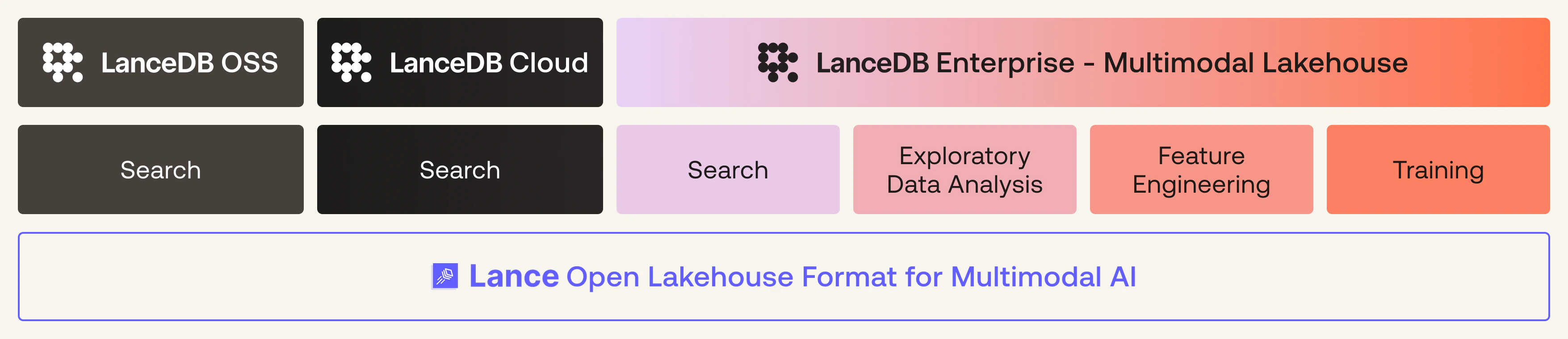 LanceDB is designed for a variety of workloads and deployment scenarios, and supports use cases that are way beyond traditional vector search. The LanceDB suite includes three products, all built on top of the same open-source Lance format and table abstractions.